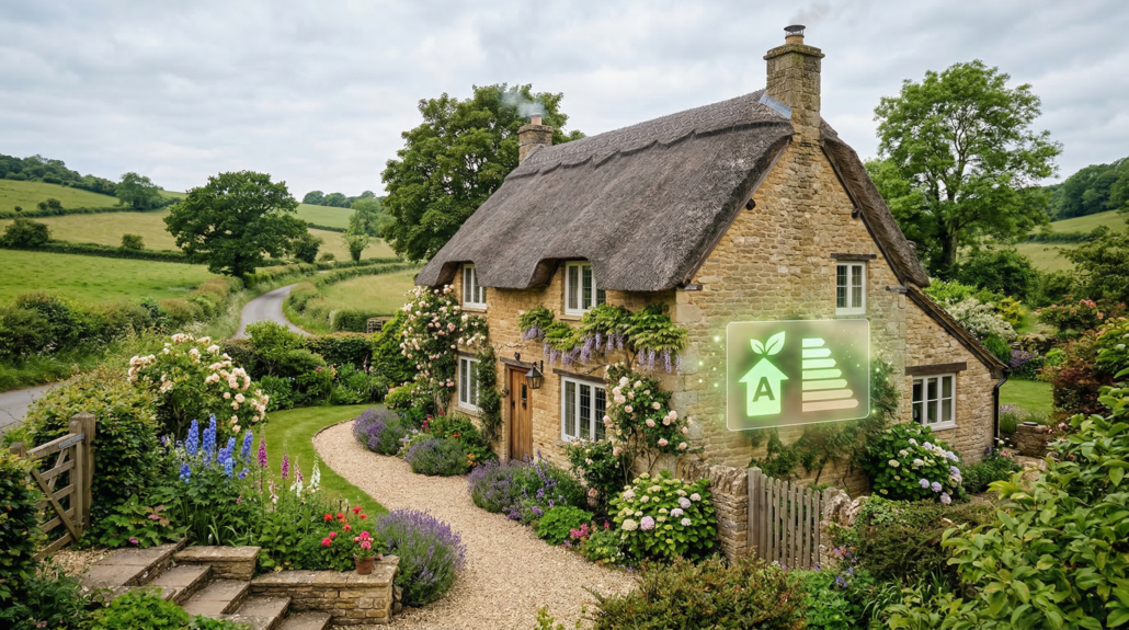 Traditional Cotswold stone cottage with energy performance rating overlay - EPC reform delay 2027