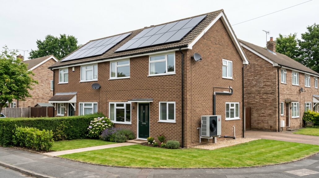 Suburban British house with solar panels and an air source heat pump installed, representing EPC energy efficiency grants for Oxfordshire landlords
